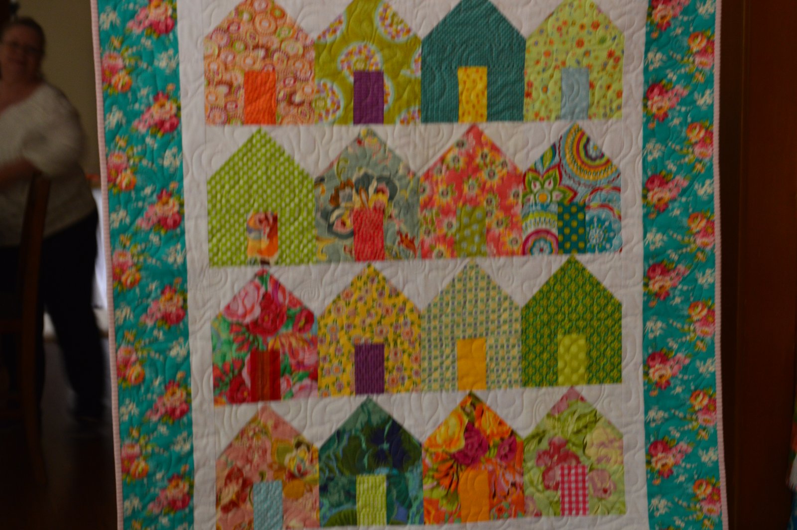 Sorry this is blurry - even so, you can tell just how wonderful this little quilt it! I like the idea of giving a "house quilt" as a baby gift, especially if someone in my neighborhood had a baby, how sweet would that be??? From all the neighbors...if the neighbors quilted...if I quilted...