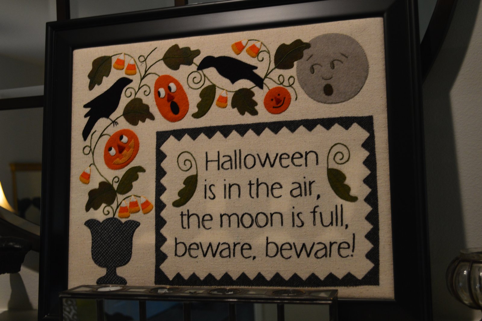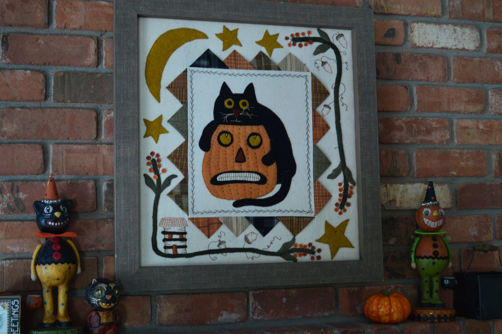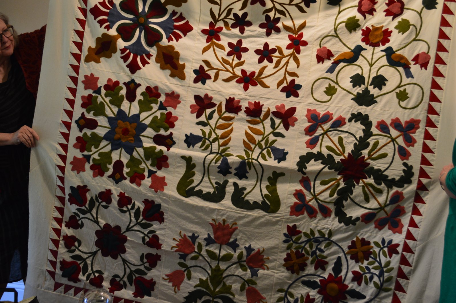 Everyone knows that by age 42 your eyesight starts to go...by age 44 almost everyone is wearing glasses...by age 46 those same people are out of glasses because they've had lasik...and then at some point they are back wearing glasses because nothing lasts forever! Above is one of Terry's hand-stitched wool pieces - Terry's work belies her age and while I don't know how old she is, I can tell you she definitely has young eyes! Even if you enlarge this picture you will be hard pressed to even see her stitches...and it's the same in person - her stitches are so small, so minute, they are practically invisible which is why she is the queen in our humble little group when it comes to anything hand-stitched!