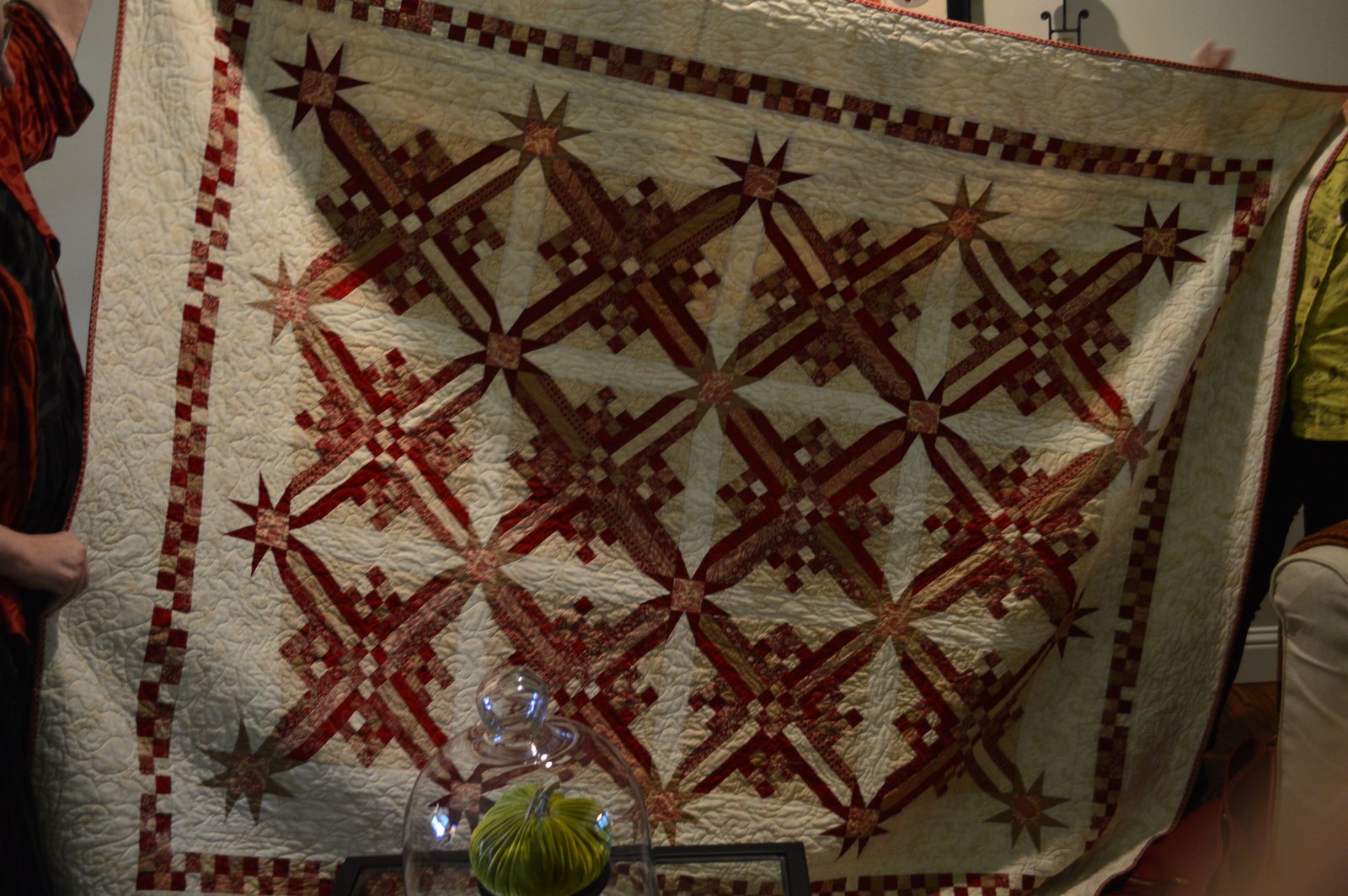 You've seen this before, this is Janet's fabulous quilt. She brought it in to show us when it was still a top...and before she took it to be quilted she wanted to iron it. Unfortunately, Janet hit the "clean iron" button and before she could stop it the iron had spit out brown water on her beautiful quilt! Once the quilt was quilted she washed it - and her unlucky streak continued because one of the reds bled all over! Thanks to a dozen color catchers she was able to get most of the bleeding out of the quilt. I do love a quilt with a good story...but I prefer a good story under a quilt!