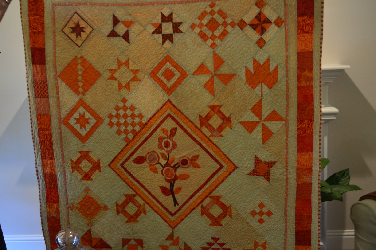 I really tried to get all of this quilt in the picture!! Seeing this quilt was like seeing an old friend...at first I didn't recognize "her" but then it came back to me! When Deborah left our group to go back to work in 2004, our quilt group made her this quilt. Deborah likes orange so that's why we used those colors. I made the center block and put the top together on point...I think I even quilted and bound this quilt, too! I was SO sad to see Deborah leave the group - she brought so much creativity to us! Now, 14 years later she has rejoined our group but we just learned she will soon be moving to the east coast - after 35 years of living in the Northwest! We are going to miss her all over again!