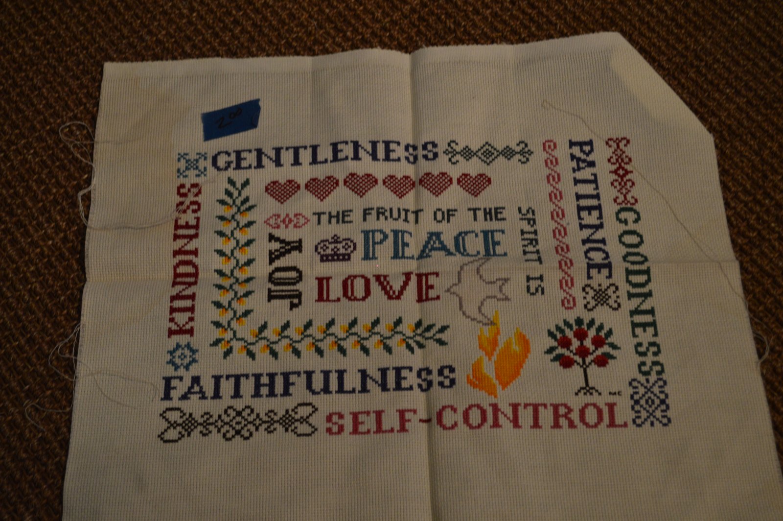 On the way to our meeting Denise stopped at the Habitat for Humanity garage sale and found this beautiful cross-stitch for just a few bucks! I really like it but I would like it better if the words self-control weren't on there...really, who needs to be reminded about that?!?! I was reading all of the beautiful words and thinking how cool it was then I read self-control and thought, uh-uh - don't need none of that!