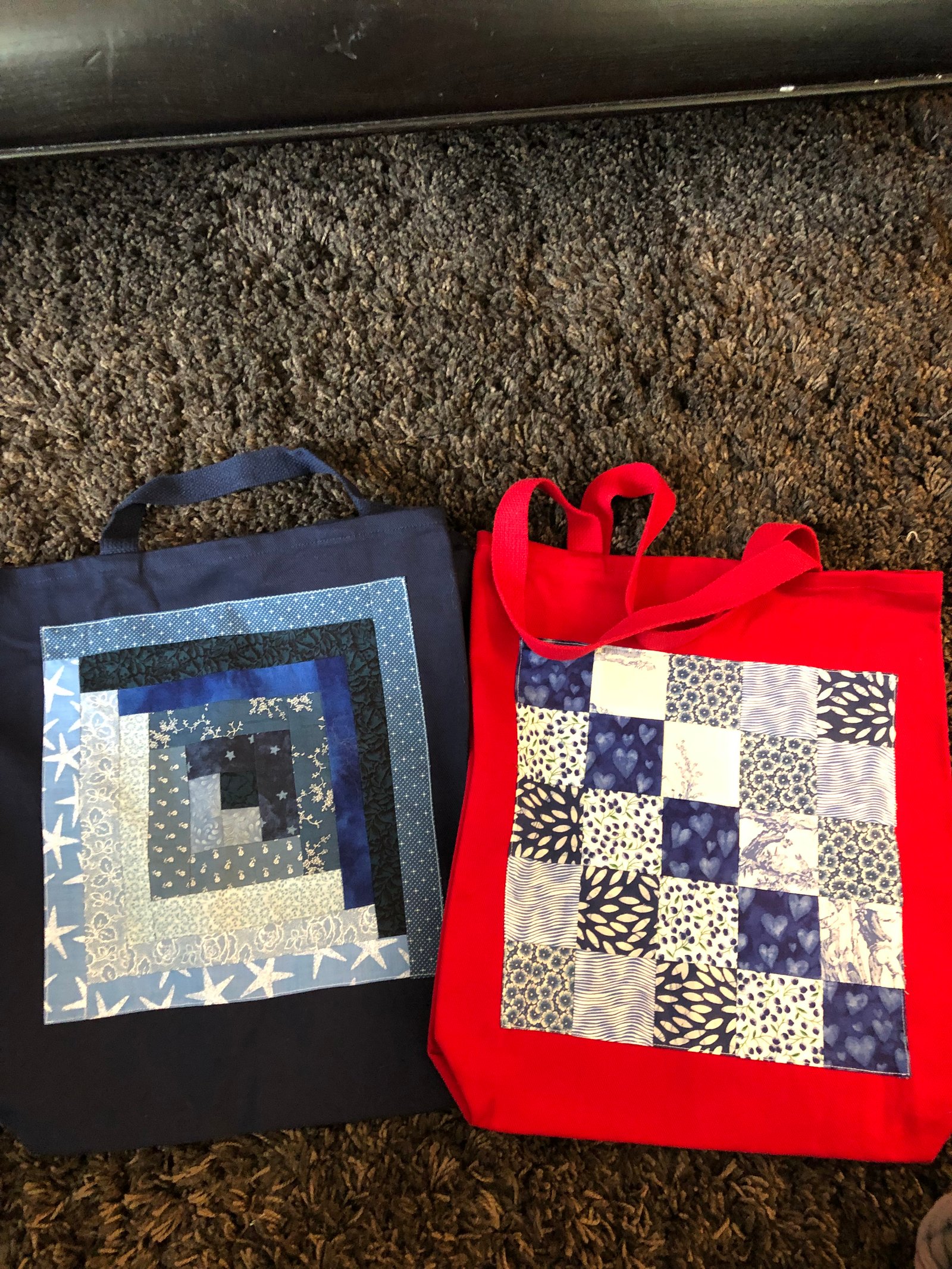 This is what you do with orphan blocks - you sew them onto tote bags. Kareena brought these bags back from a trip to Utah, she didn't make these, but she thought some of us in the group made the blocks and Helen seemed to recognize the fabrics - this was from a project a long time ago. Our blocks do get around!