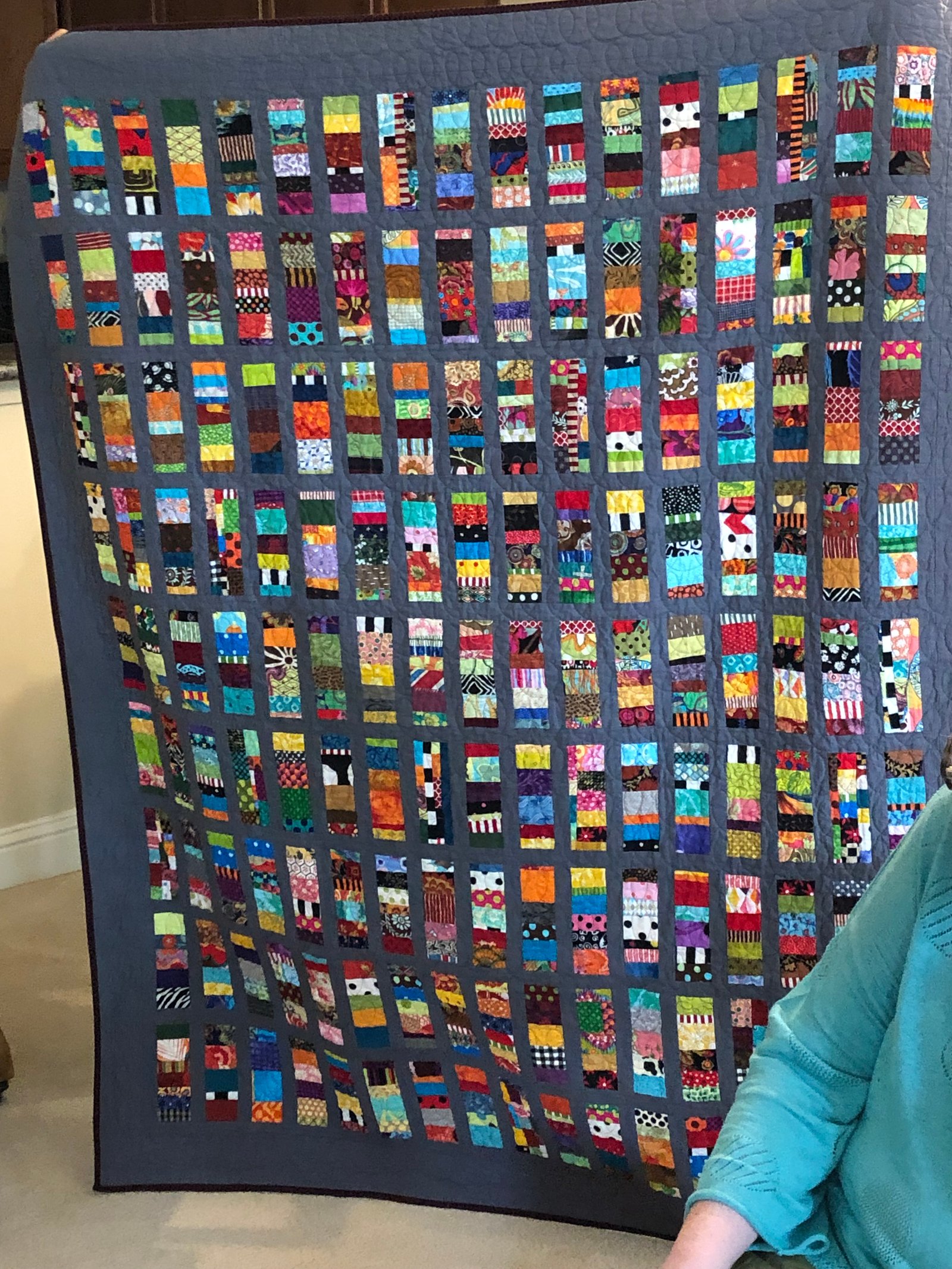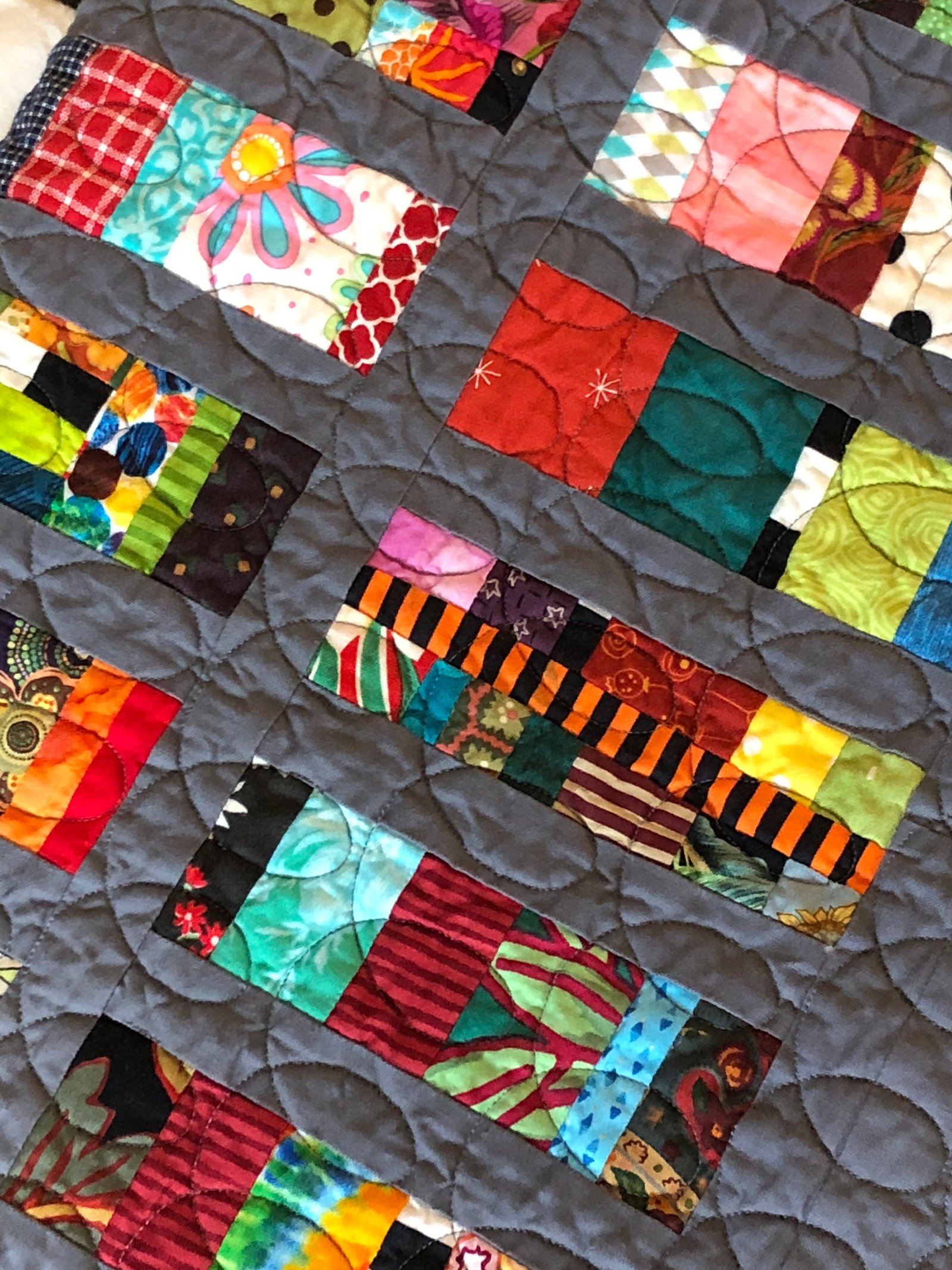 This is the back of Stephanie's quilt on the left and on the right, a close up of those teeny tiny strips of fabric. I have got to rethink my scraps...I would have thrown out all of those scraps and not given it a second thought!