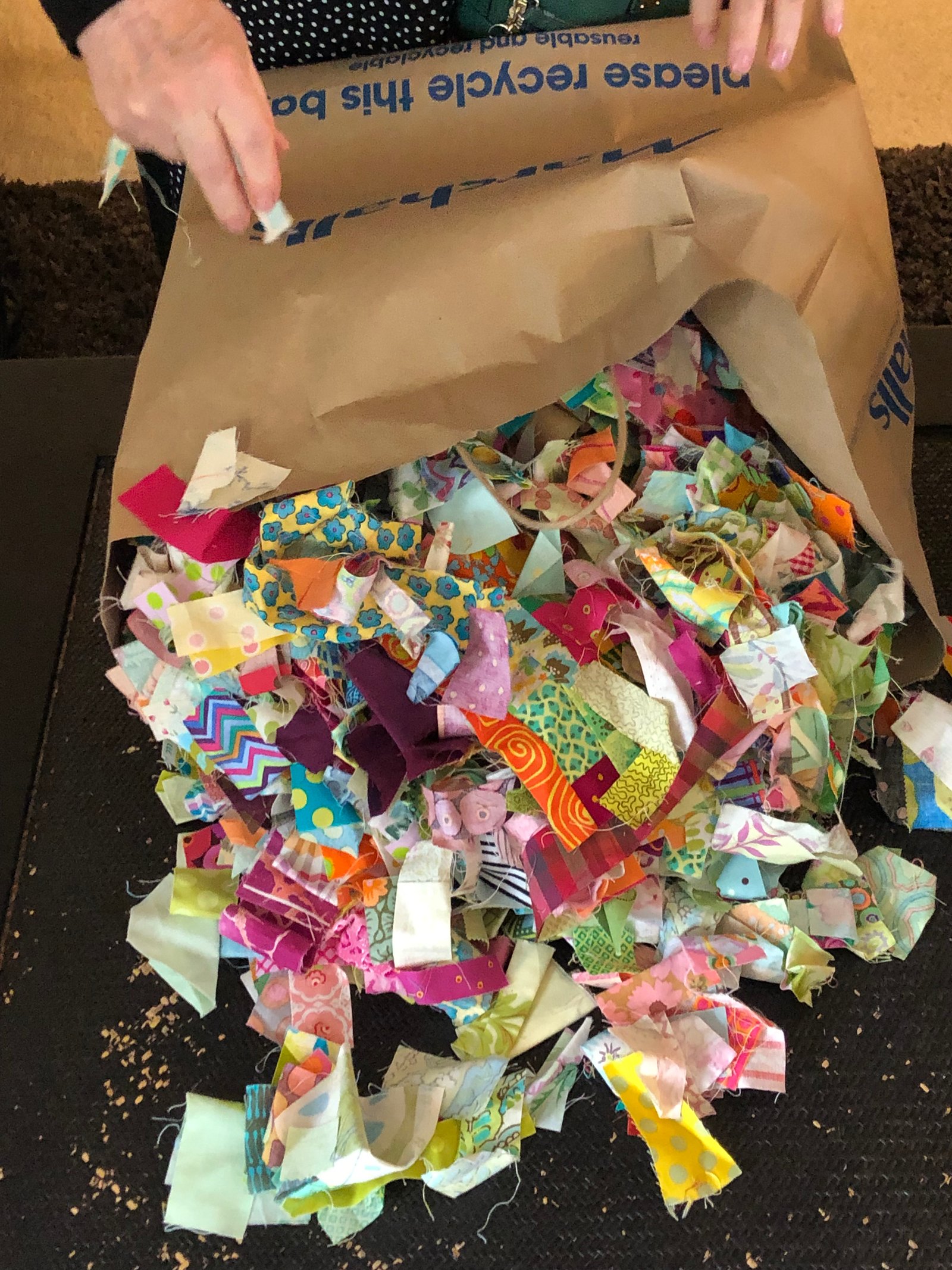 After Stephanie showed us her quilt, Helen showed us her bag of scraps...which she gave to Stephanie. I would have tossed that entire bag!!! Maybe a scrap intervention is what I need? Stephanie will make something fabulous out of those scraps and I will be jealous and then mad at myself for being scrap-lazy.