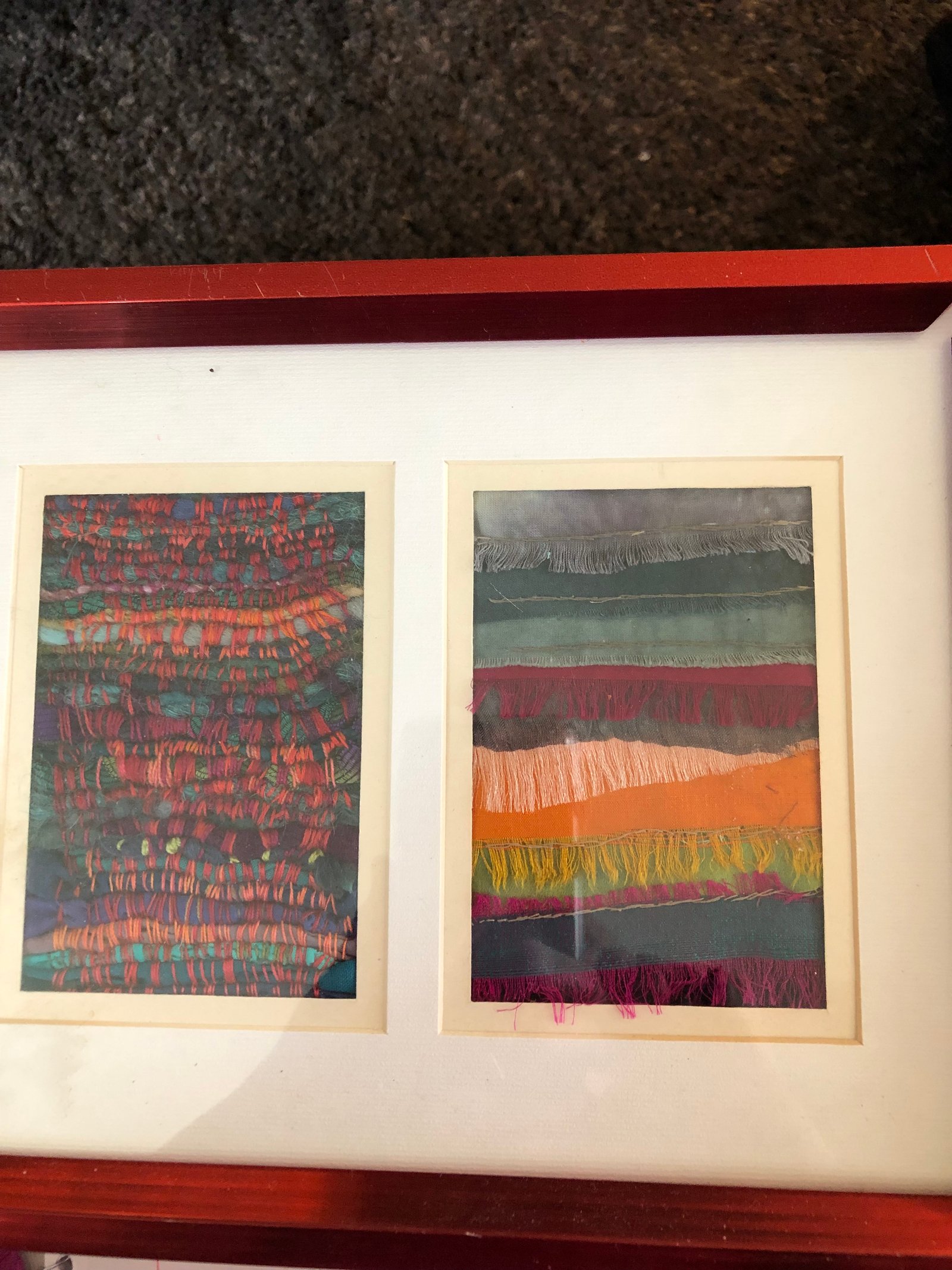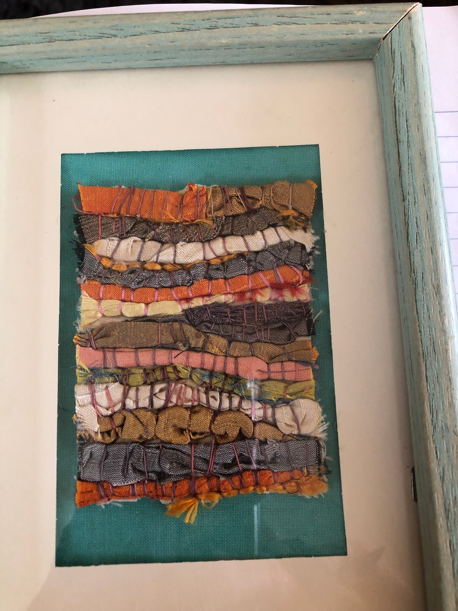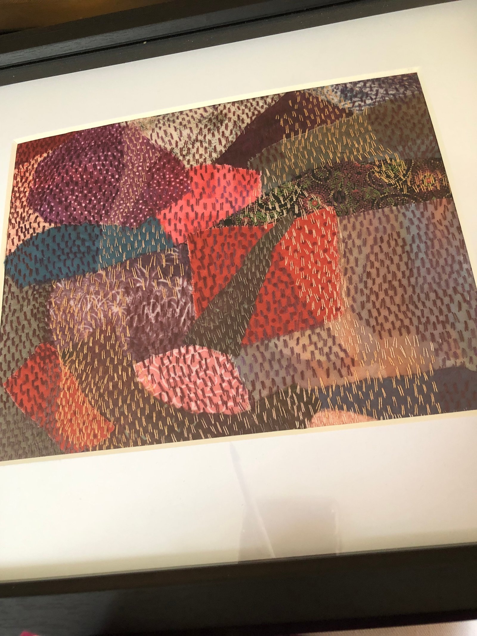Couched fabric, hand-stitched and framed. Deborah said by the time her husband is given the all-clear she will have enough of these made to have her own booth at an arts and craft fair and we all agreed she should do that - I'd buy one...or two...