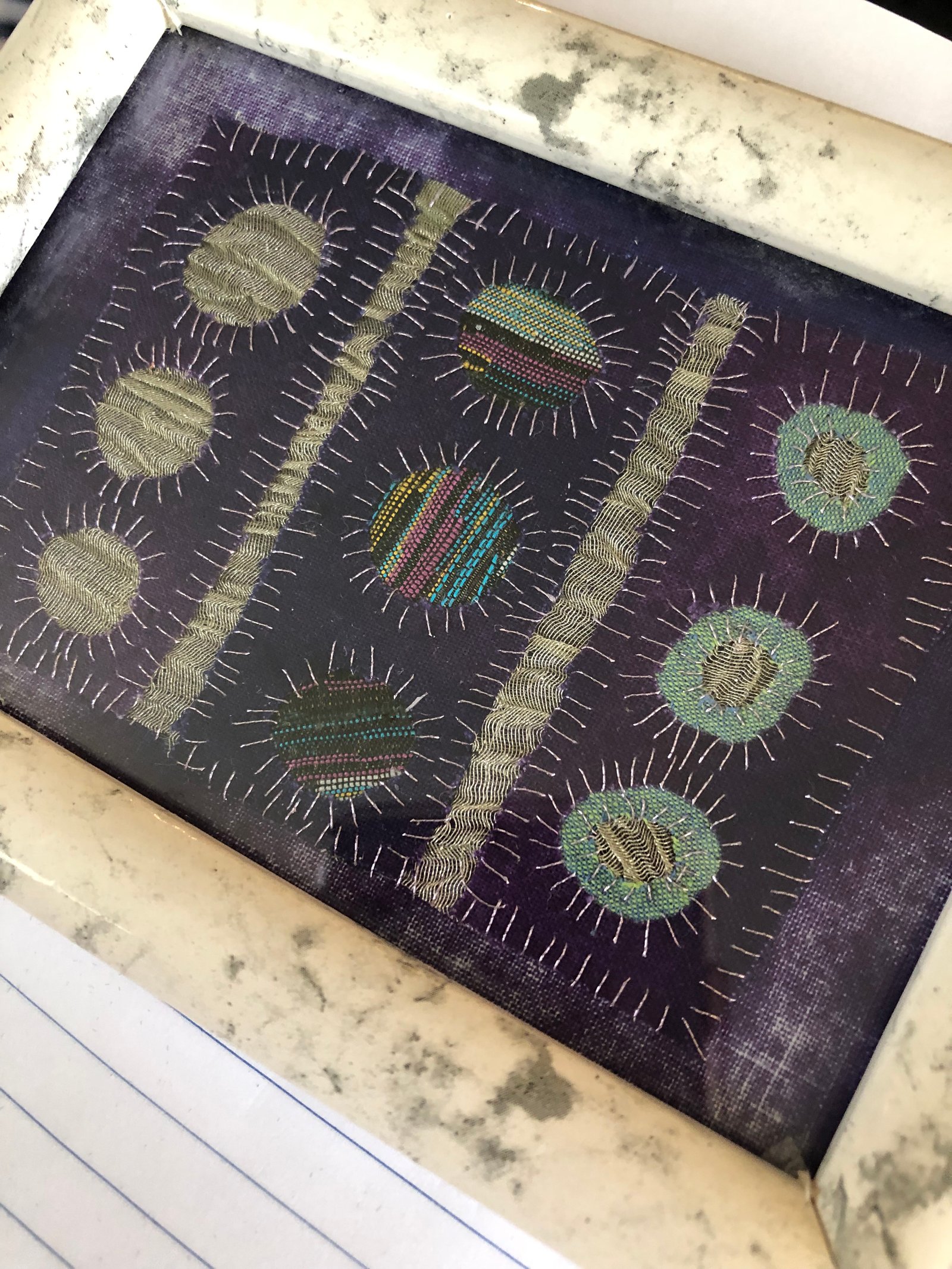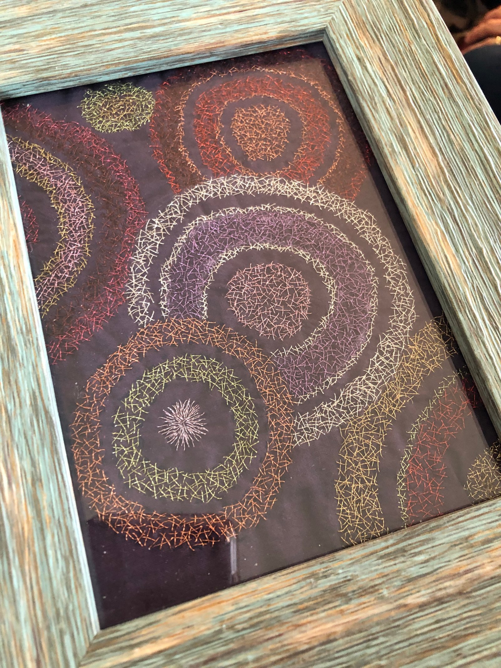 Deborah was able to come to our meeting, which was wonderful because her husband recently had a stem cell transplant and seeing Deborah meant he was doing GREAT - well enough so she could join us! While she's been back and forth to the hospital with her husband, she's been busy working on these incredible pieces of art, which she called her "stitching experiments"...every little thread is a stitch she made by hand.
