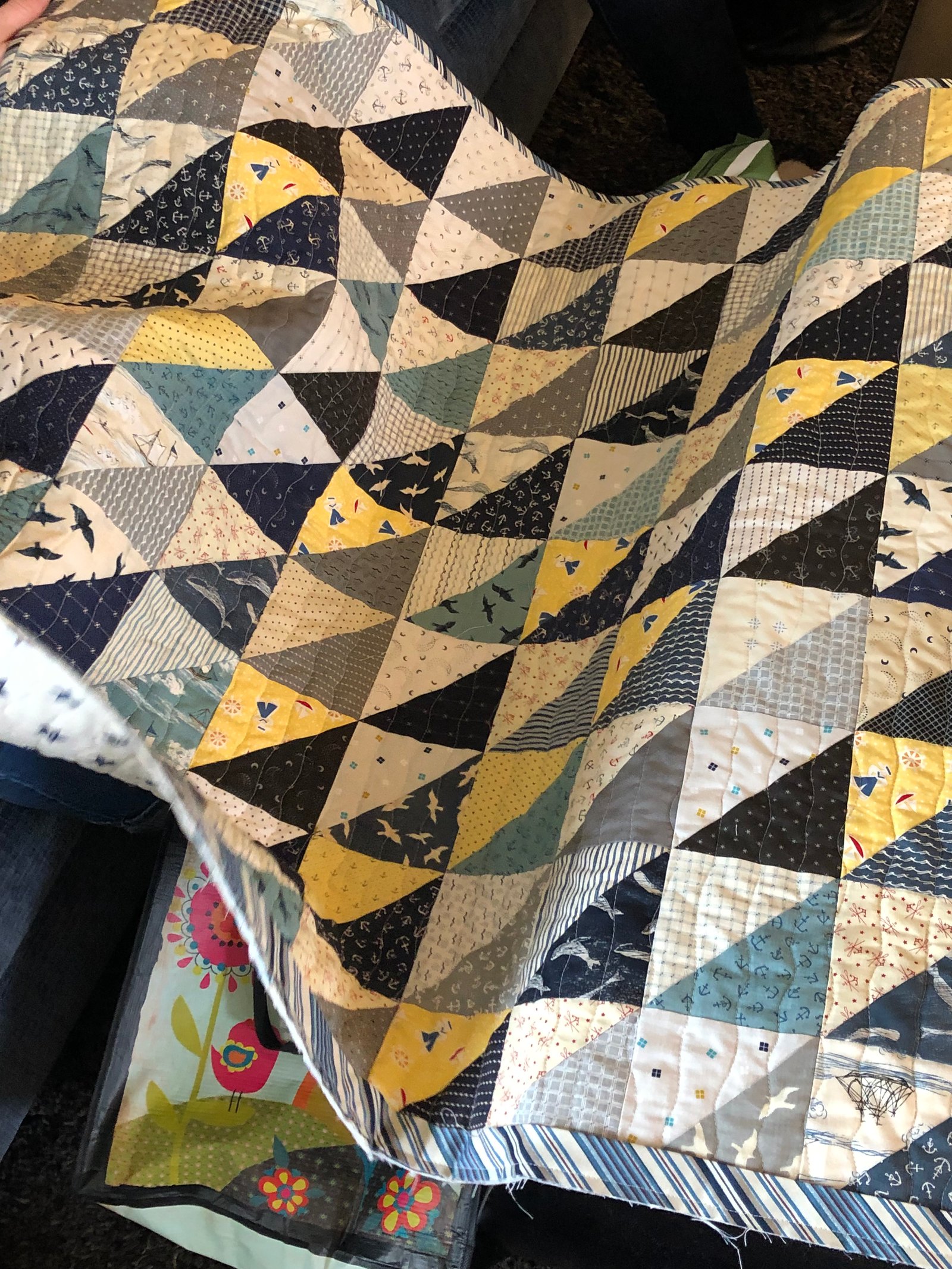 Barbara was working on this quilt's binding at our meeting - trying to get this finished for her newest grandbaby. Barbara has 21 grandchildren and will probably get a few more! This is such a cute quilt - I love the fabrics - the touch of yellow is perfect with the blues and grays.