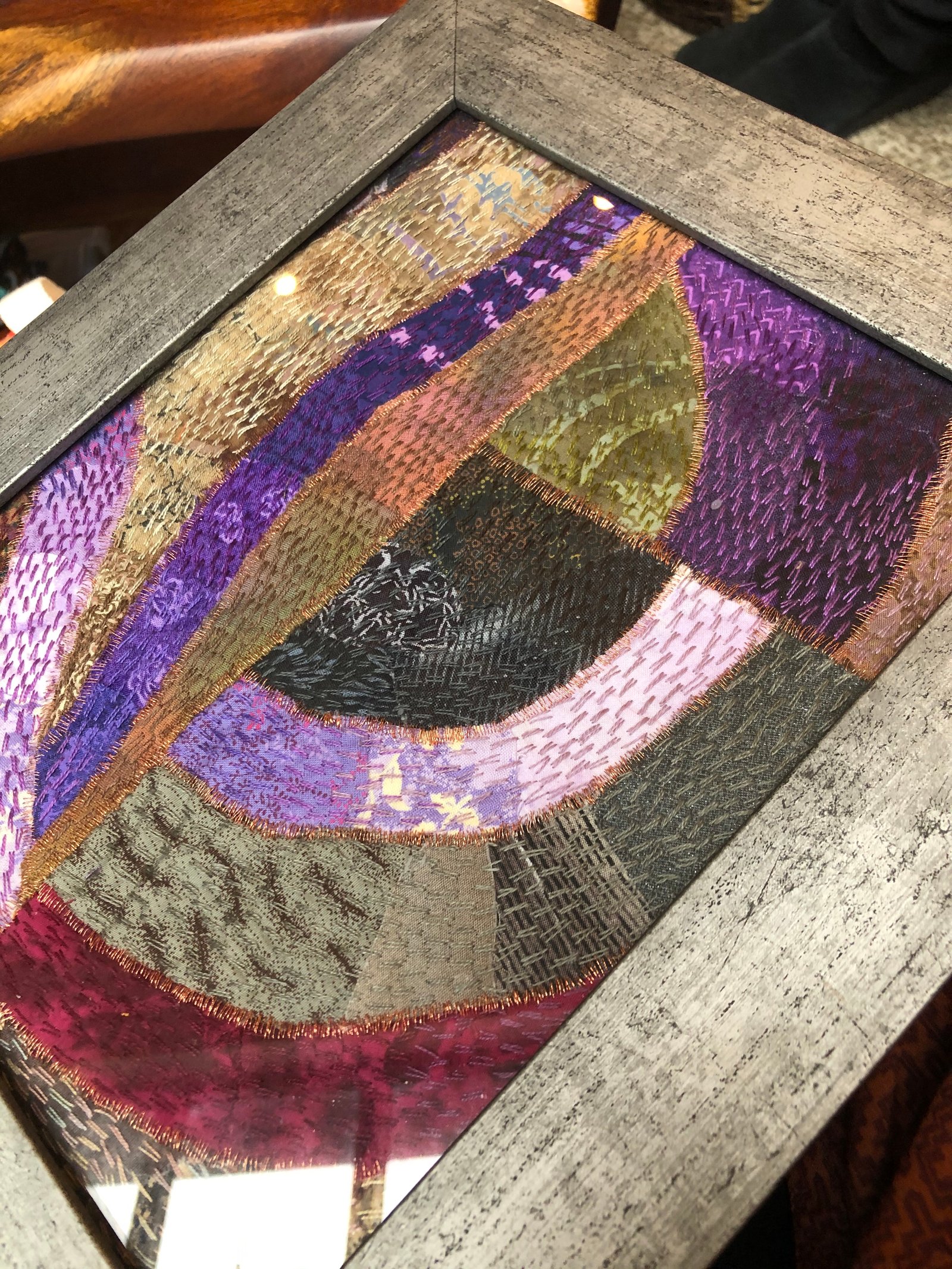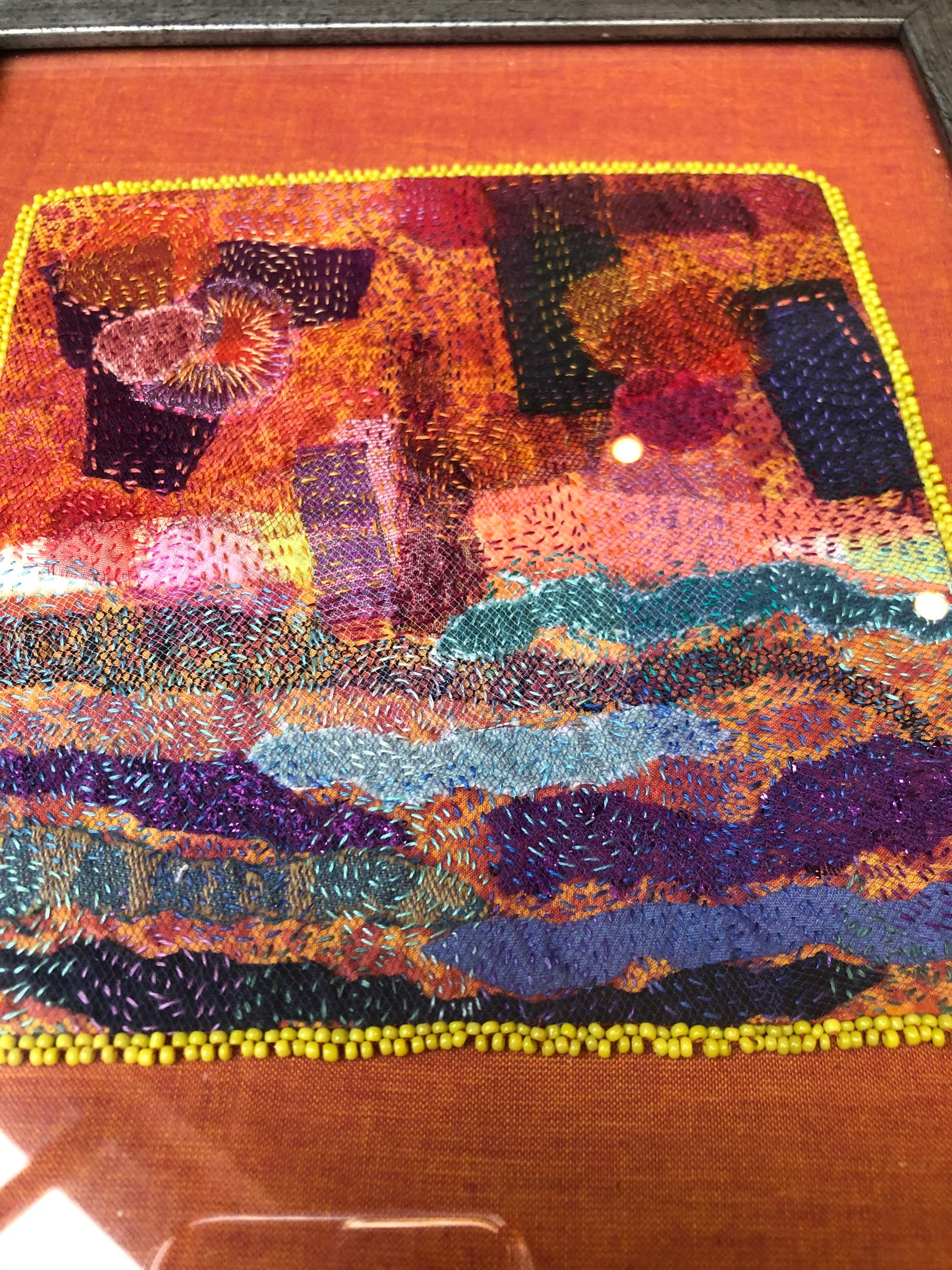 Deborah also brought in two more of her framed stitcheries...for lack of a better word. Every single little stitch is hand done - it's not fabric - it's thread Deborah carefully stitches onto fabric that she has purposely placed...again, mind blown. After all of that stitching she added beads to the edge of the one on the left! Tiny little seed beads! Wow...just WOW! Deborah said she was inspired by Paul Klee, you can check out some of his art by clicking here.