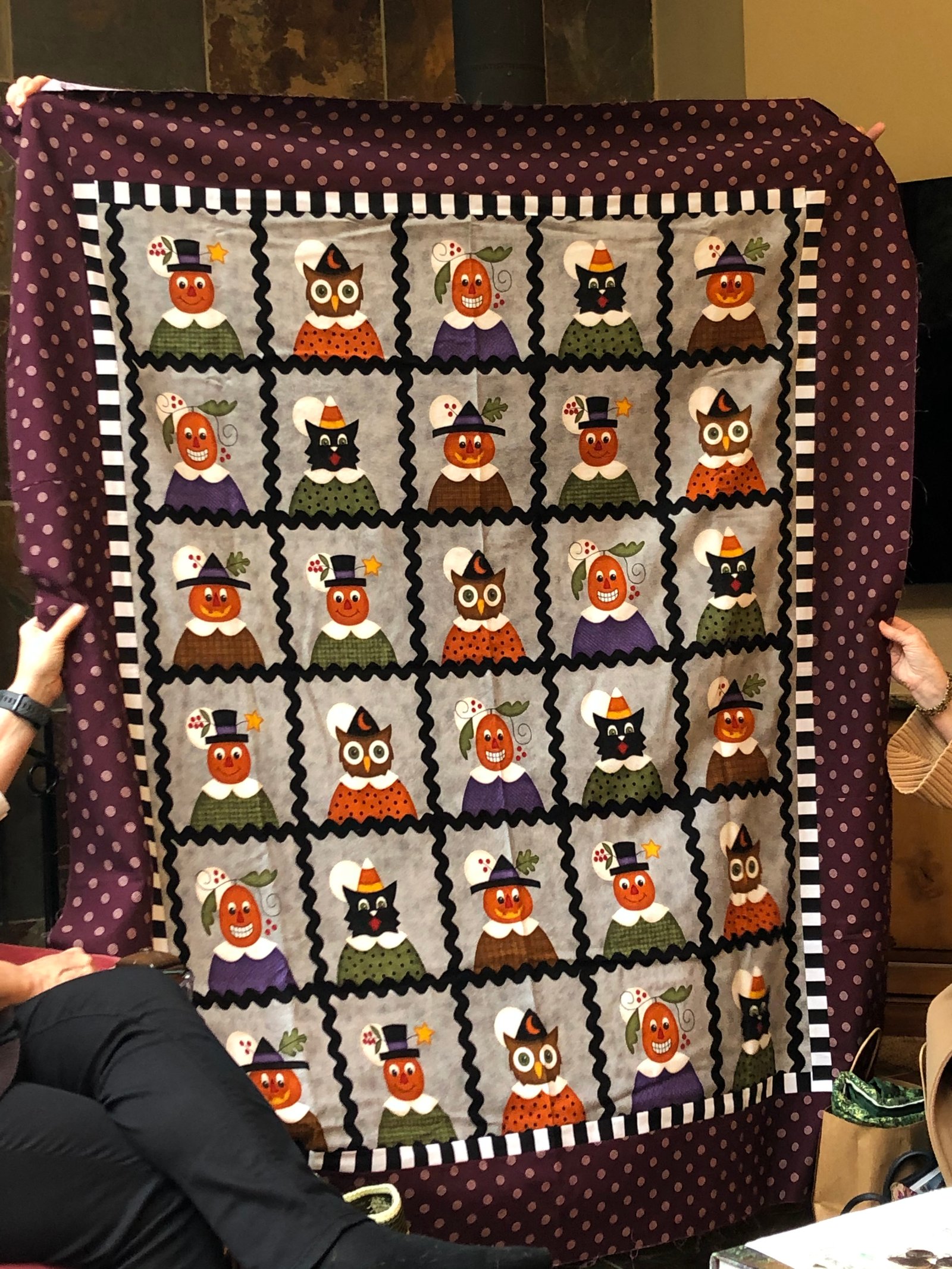 Jenny liked the Halloween quilt Helen made so much (I made one, too, thanks to panels gifted to us from Terry) that she ordered two panels for herself. I like the one on the right best - something about that purple border, wish I'd thought of that! (Halloween panels available from Missouri Star Quilts.) Very cute Jen!