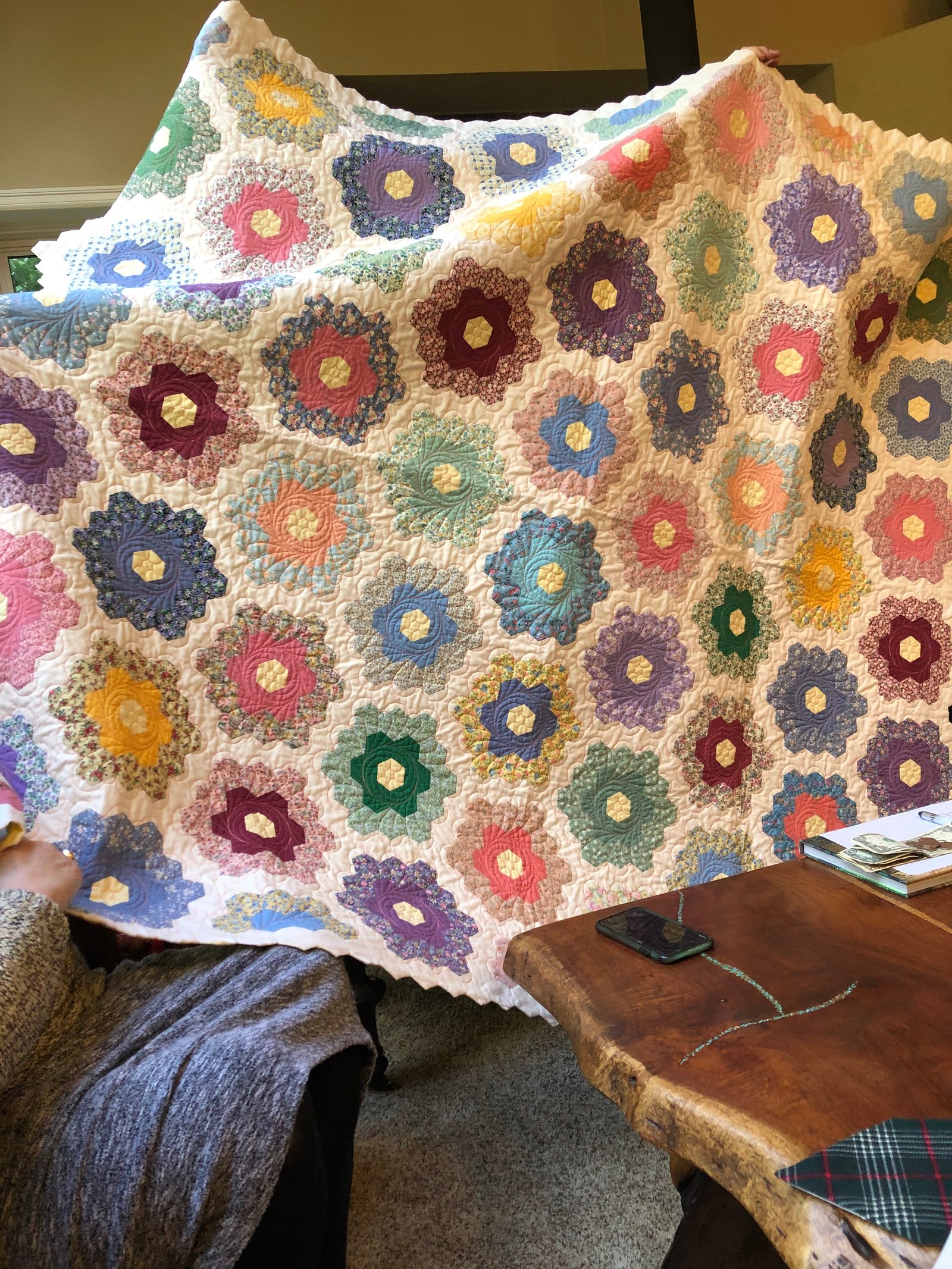 Several of us missed seeing Marsha's flower garden quilt so she was asked to bring it again - and it is definitely worth another look. If you don't remember the story let me refresh your memory...Marsha started working on her hexies 25 years ago. She began to think she would never get the quilt finished so she gave it to her sister Shelly, who not only finished the quilt, and in record time, but then gave it back to Marsha! Truly a labor of love and it shows just how much Marsha and her sister love each other. Now look at the back of this quilt: