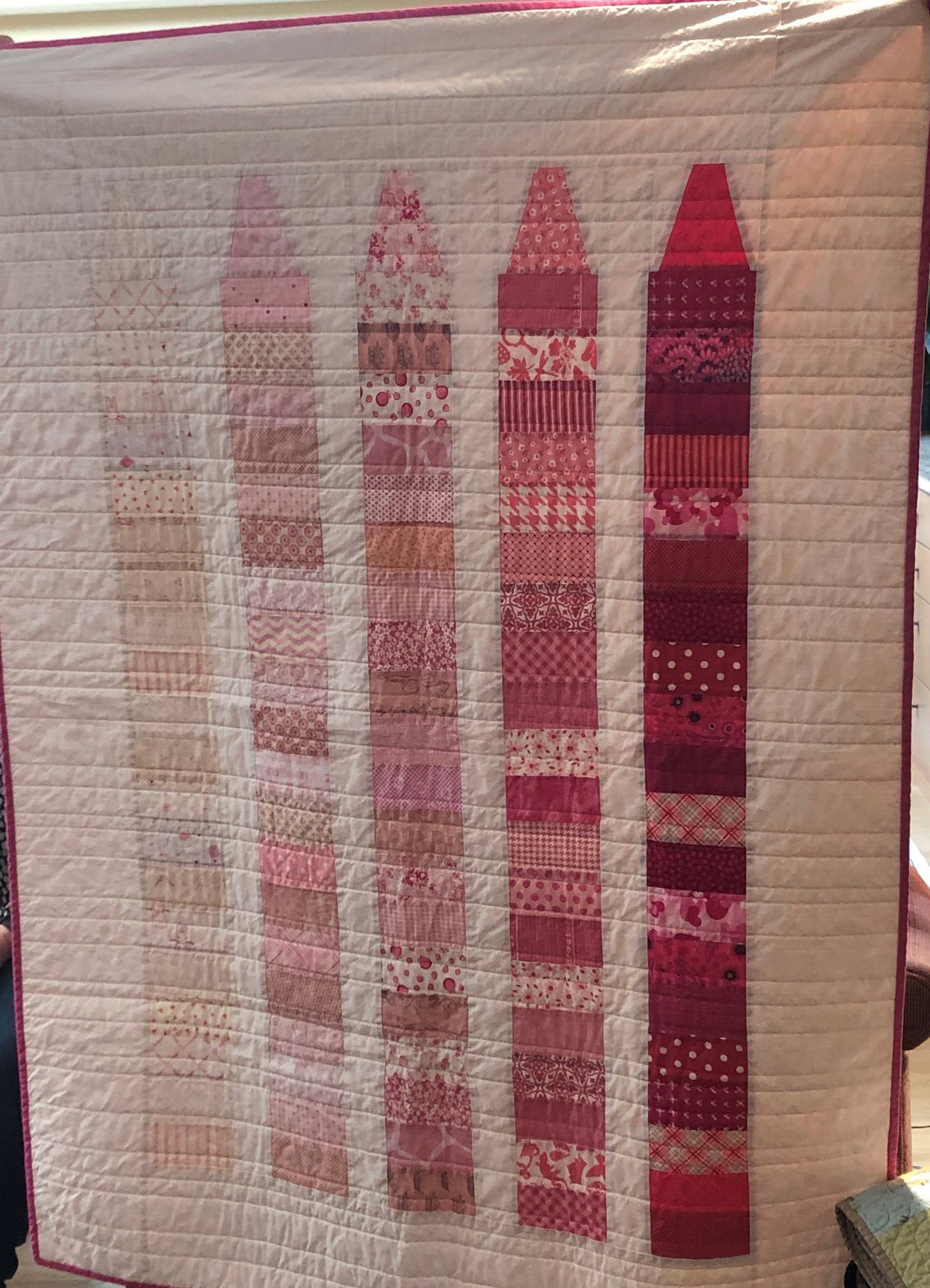 Love, love, love this! And my grand-daughter would love this, too...hint-hint! Kareena has made a couple of these crayon quilts and this one is my favorite. When I was a kid, on those rare occasions when I would have a box of Crayola 24's, I would always grab the pink crayon first - it was and is my favorite crayon - you have a favorite crayon, too, right? I love how this quilt was quilted - perfectly! Way to go Kareena, it's a keeper!
