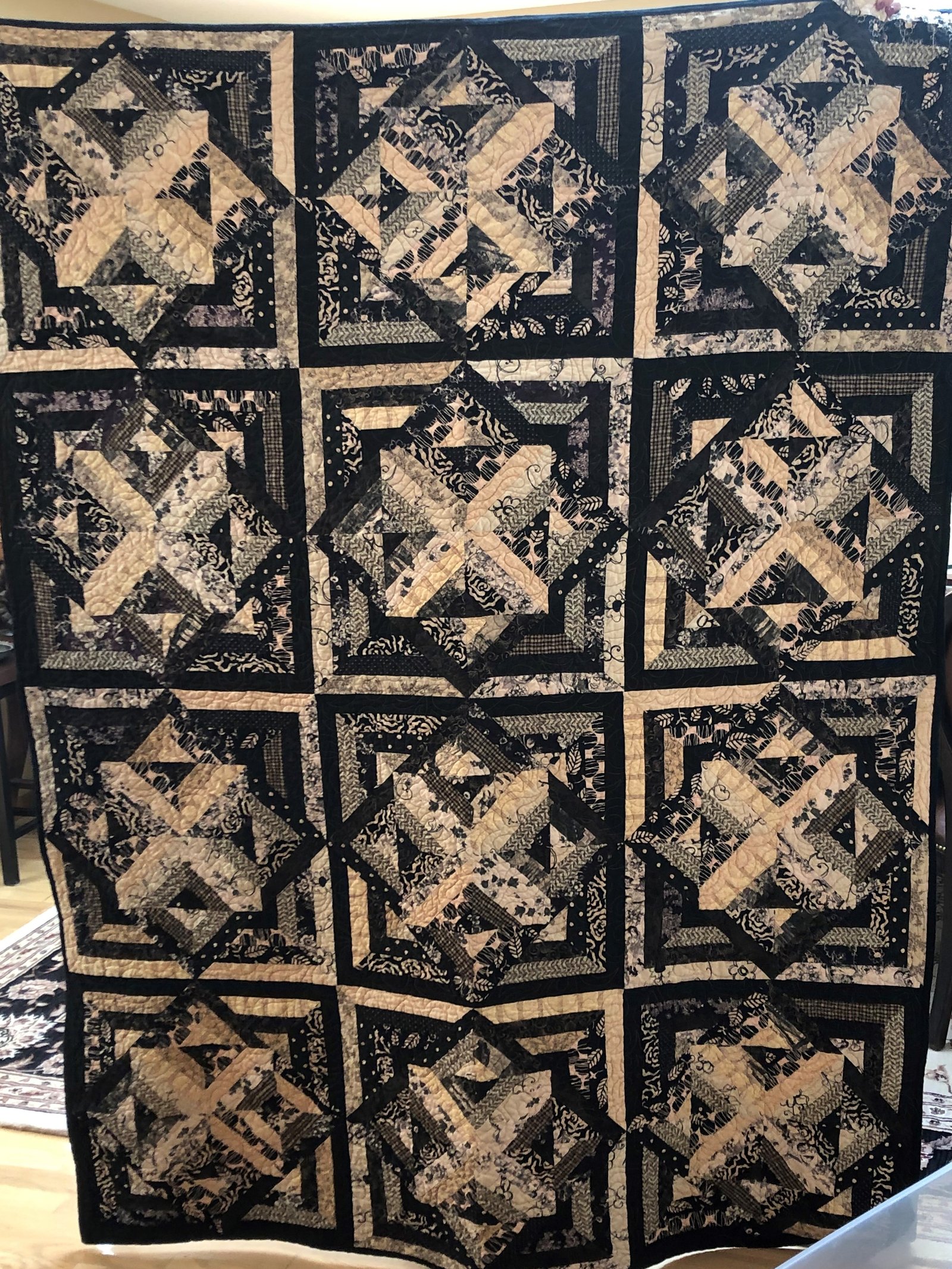 The above quilt was made by Jenny for a very special friend. I took a picture of this quilt at our meeting but it turned out all blurry - shock! I found this picture Jenny had posted on FB, so I stole it so I could show you her stunning quilt. Aside from being a very cool quilt, this quilt started somewhere else besides Jenny's work room...Jenny bought the center piece of this quilt at a quilt show boutique! Then she added to it making it the fabulous quilt it is now - I hope you can click on this picture to see the quilting, it's pretty incredible. Jenny even "ice-dyed" the green-blue pieces of fabrics she added to this quilt. The binding is perfect and everything just came together and works so nicely. I know her friend will love this quilt, probably not as much as she loves Jenny but close!
