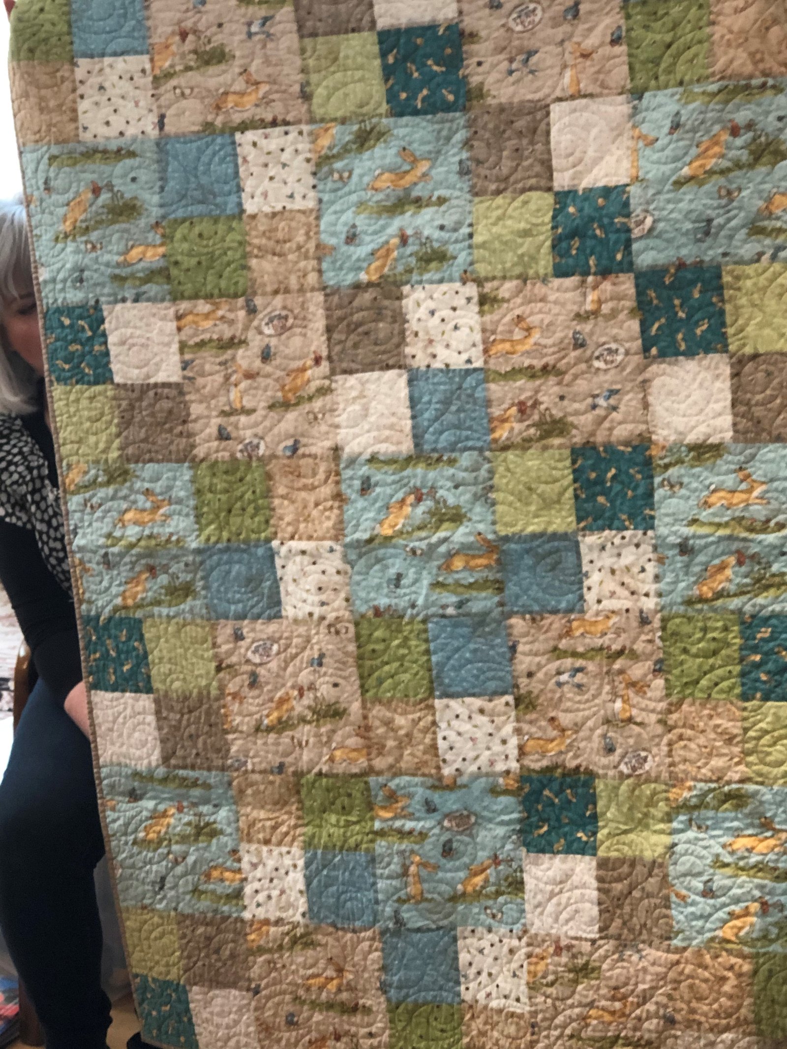 Kareena said she's been on a mission to use up her scraps so she has been busy! This sweet baby quilt is beautifully quilted and that bunny fabric is very cute. I thought it was the perfect crib size but then it was called to my attention that blankets aren't allowed in cribs any more! What is this world coming to?!?!?