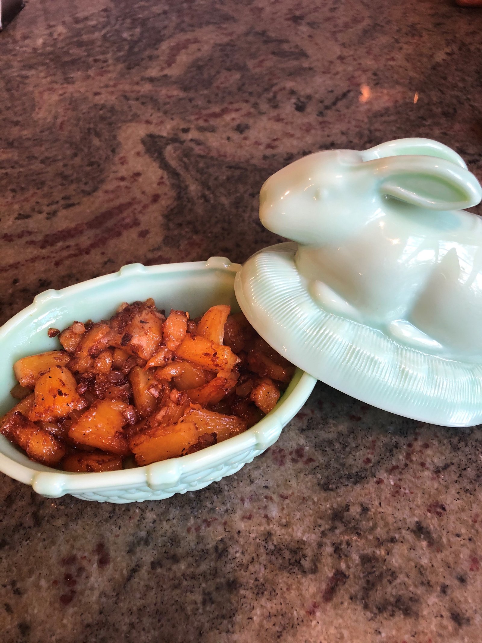 I love chutneys, the sweet with the sour, and this chutney provides just enough of both. It is just what your Easter ham needs, trust me! I think most of the ham-eating world puts pineapple on their ham when it bakes, some even put maraschino cherries in the middle of the pineapple slices for that extra "curb appeal." I won't go that far, I'll go farther...I'll serve our ham with individual sides of pineapple chutney so everyone can have their own personal culinary awakening!