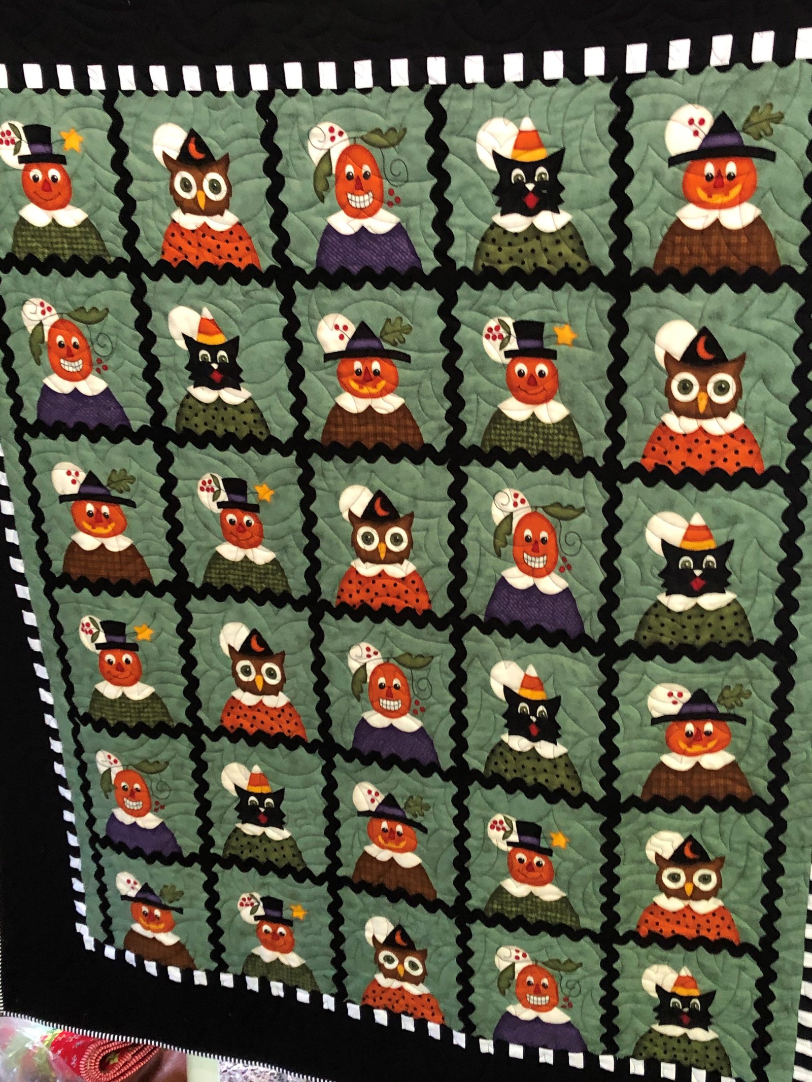 I think Terry is the one who gave many of us this Halloween panel and she brought in the one she finished. Like Terry, most of us copied the way Helen finished her panel, with the big black and white stripe, it is just so cute and this quilt is flannel so it is warm and cuddly, perfect to wrap up in while sorting Halloween candy after trick-or-treating!