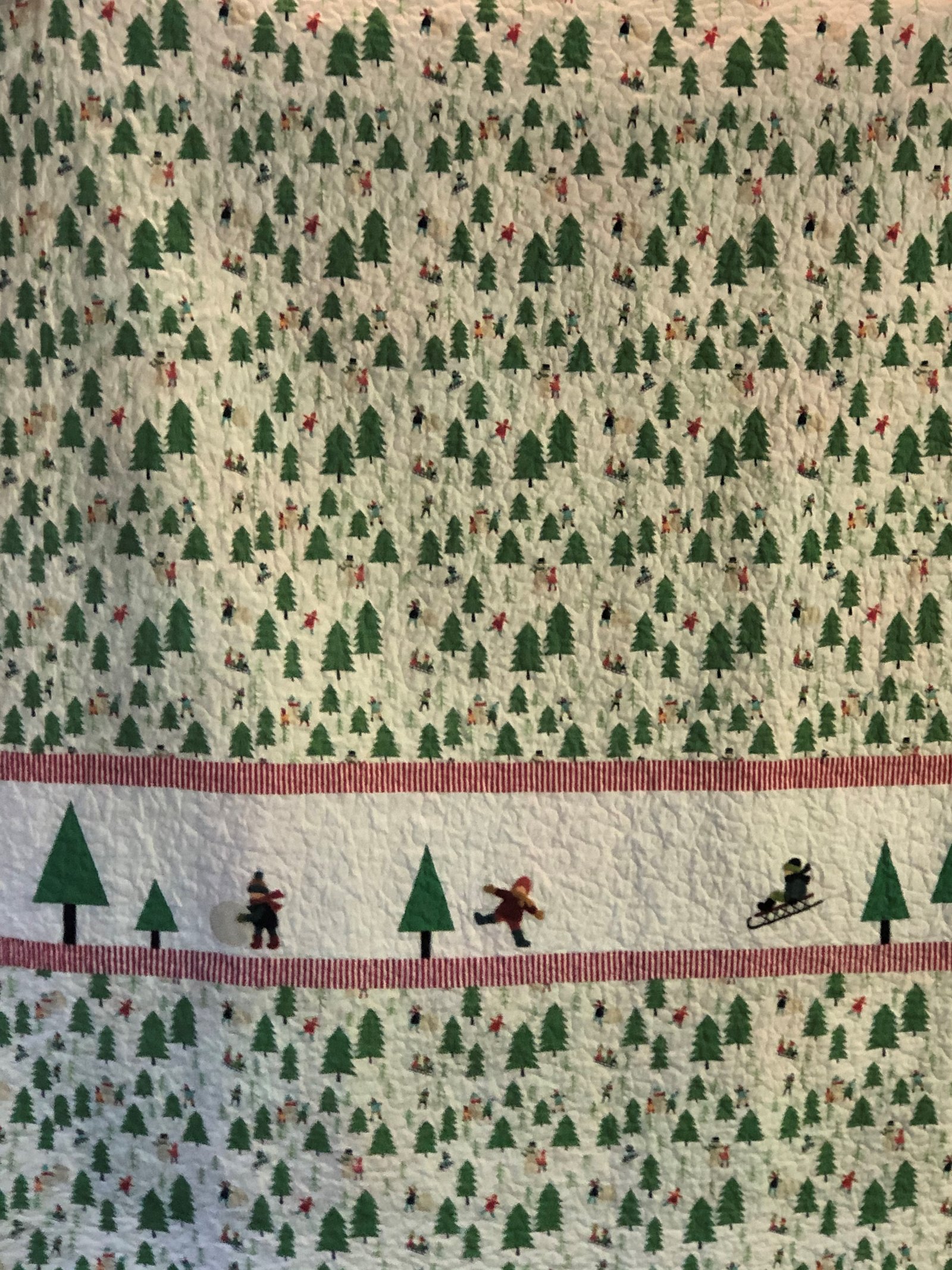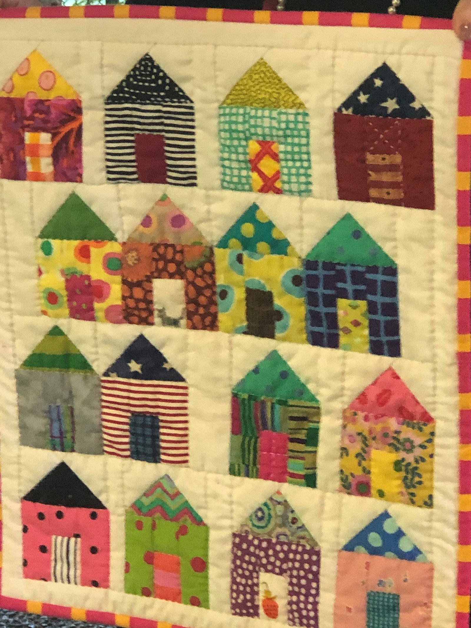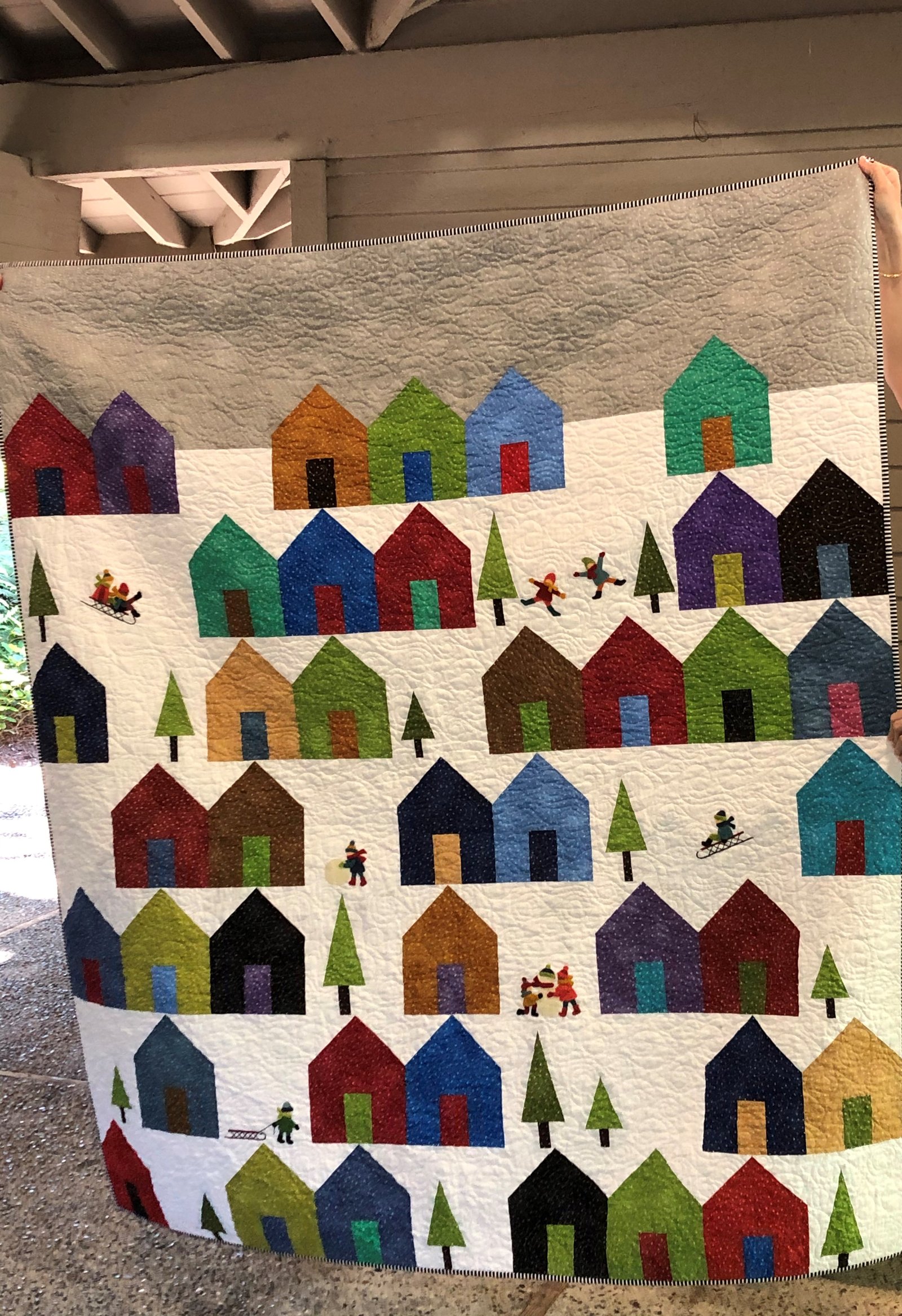 Just take a minute and look at all of the detail in this quilt by Terry. All of the houses have white dots on them...it's snowing! The quilting might be hard to see but it's a swirl pattern, like the snow is swirling around and I love the top of the quilt, the perfect winter sky! This is a Cluck Cluck Sew pattern and Terry made it better by adding trees between the houses and her little embroidered people. I love this quilt. Just love it. Wish I'd thought of polka-dotted fabric for my house quilt!