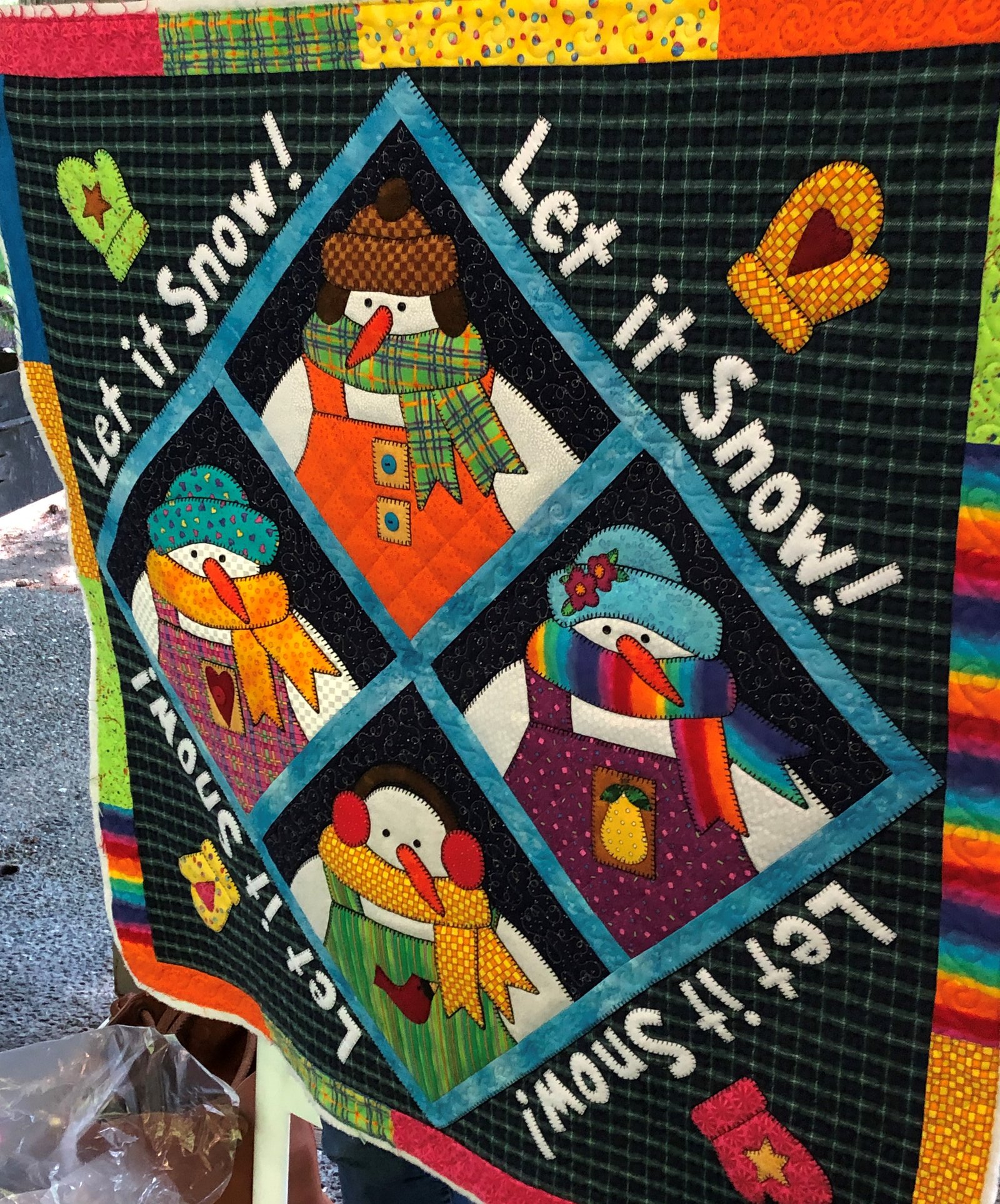 Terry showed us this quilt a while back, she had a different border on it and at the time she said she didn't like it. She took the fabric she didn't like off and put on the white fabric border, a perfect "snow" border for her snowball quilt. It's hard to see but on the bottom right corner Terry added her "signature" touch - a bit of wool embroidery of kids making a snowman. Love this!