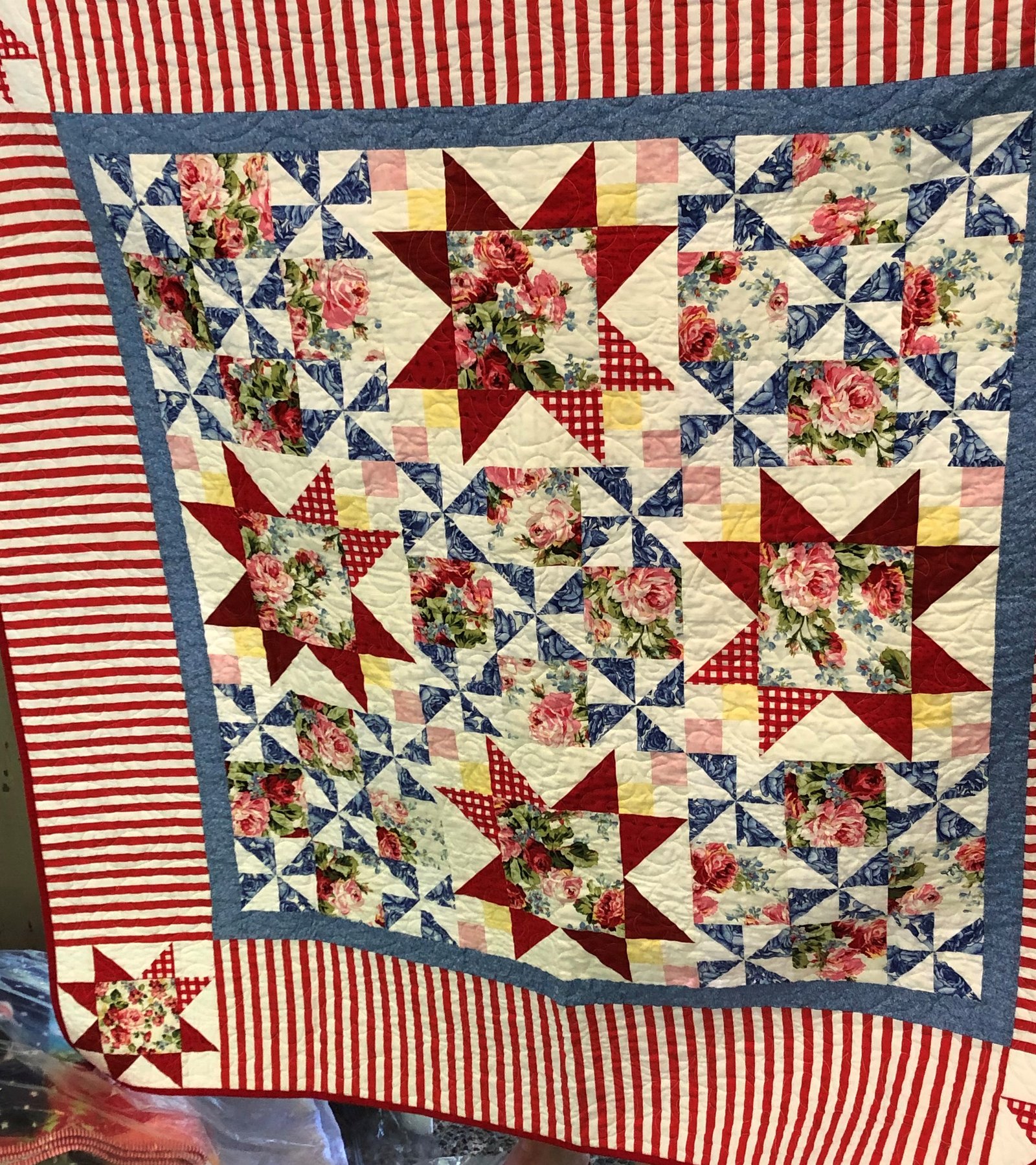 Let's start off with Terry's quilts and not because she has a daughter who lives in Korea or because I'd like to hear about her last trip to Seoul, I'm certainly not THAT obsessed, but I mean, if she were to tell me about her trip, like where she went and if she happened to see Captain Ri or Dr. Lee, well I would listen because it would be rude not to! Terry came with a lot of quilts, she's been very productive during quarantine and has finished up a lot of projects, like this beautiful vintage-looking quilt, which reminded me of one of my mom's tablecloths from yesteryear.