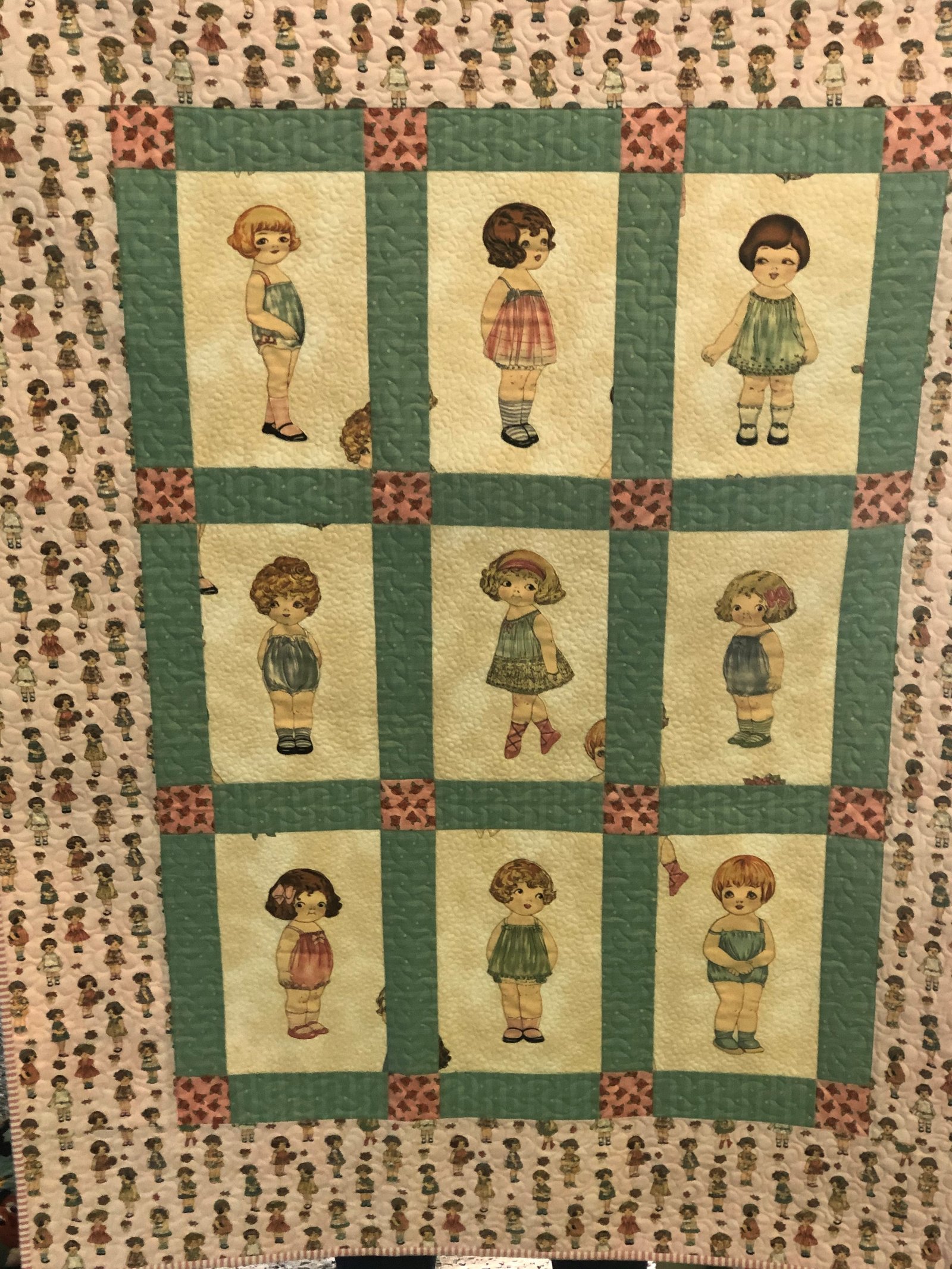 Did you have paper dolls as a kid? My mom used to get McCall's magazine in the mail and in the back of the magazine there was always a paper doll. I was about 8 years old and I remember how happy I would be when I saw the magazine, knowing it would have a gift for me! I love this sweet quilt Terry made, and the border fabric is perfect!