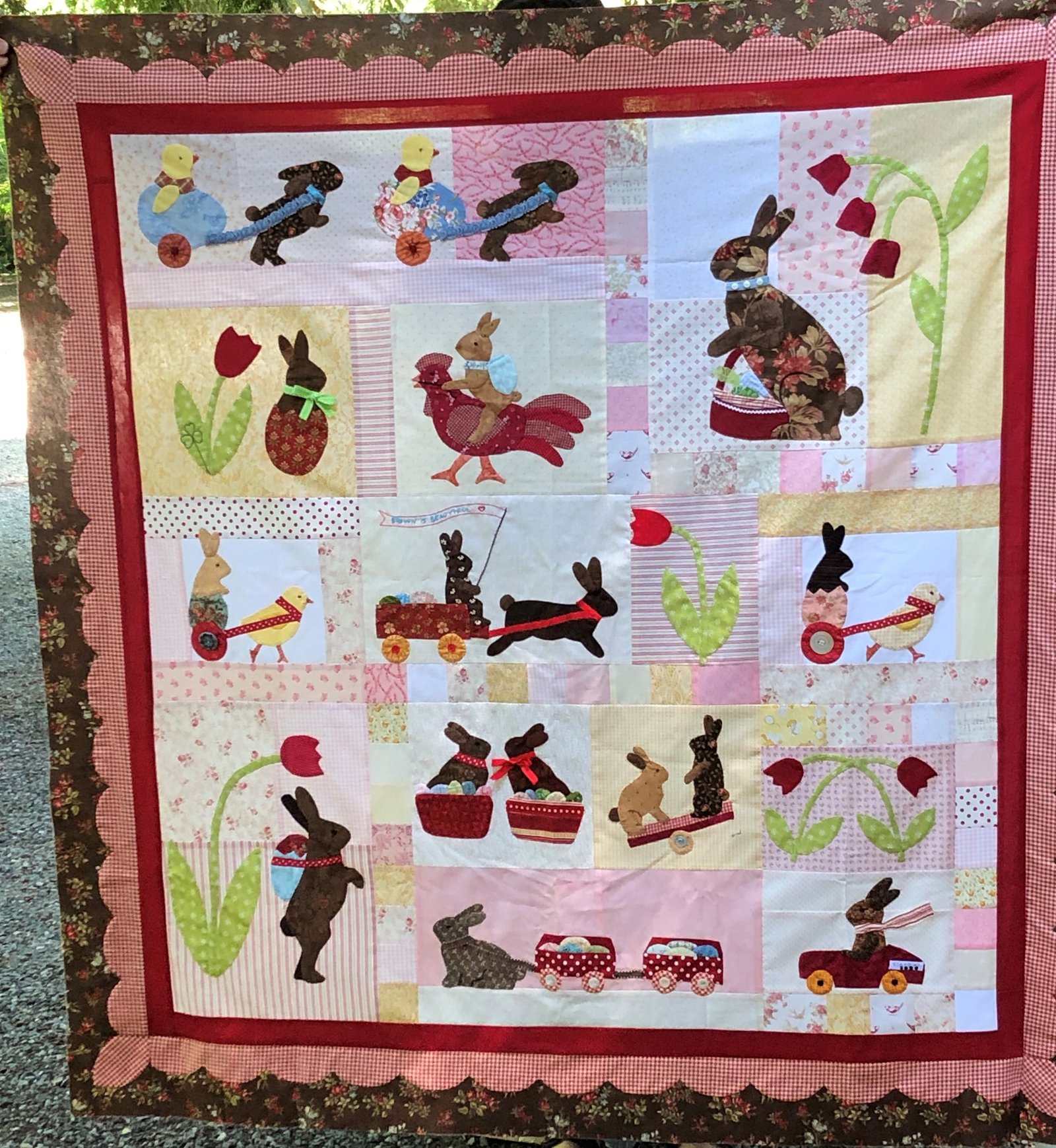 This beautiful bunny quilt was made by Jenny. There are a few personal touches on this quilt that make this so much more wonderful. Click on this to enlarge so you can see the details, like the bunny in the wagon holding the banner and the bunny in the bottom right corner - Jenny managed to get this top done while redoing a house to sell - she's somewhat of a miracle worker.