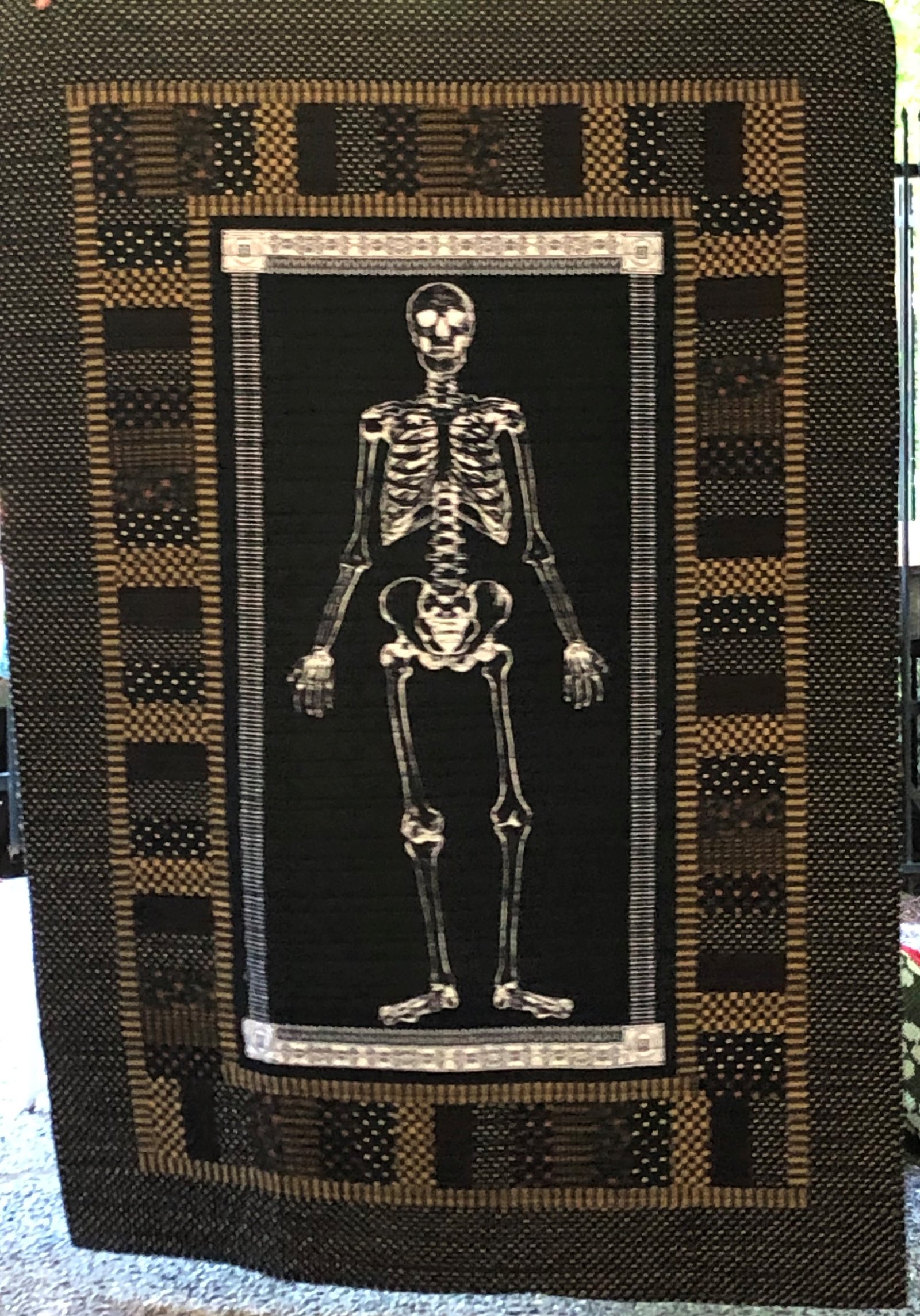 Stephanie bought this panel at Value Village and added all of the borders to make this into a dang cute Halloween quilt and get this, the skeleton even GLOWS in the dark!!! How fun is that! This is an Obliteride quilt, too!